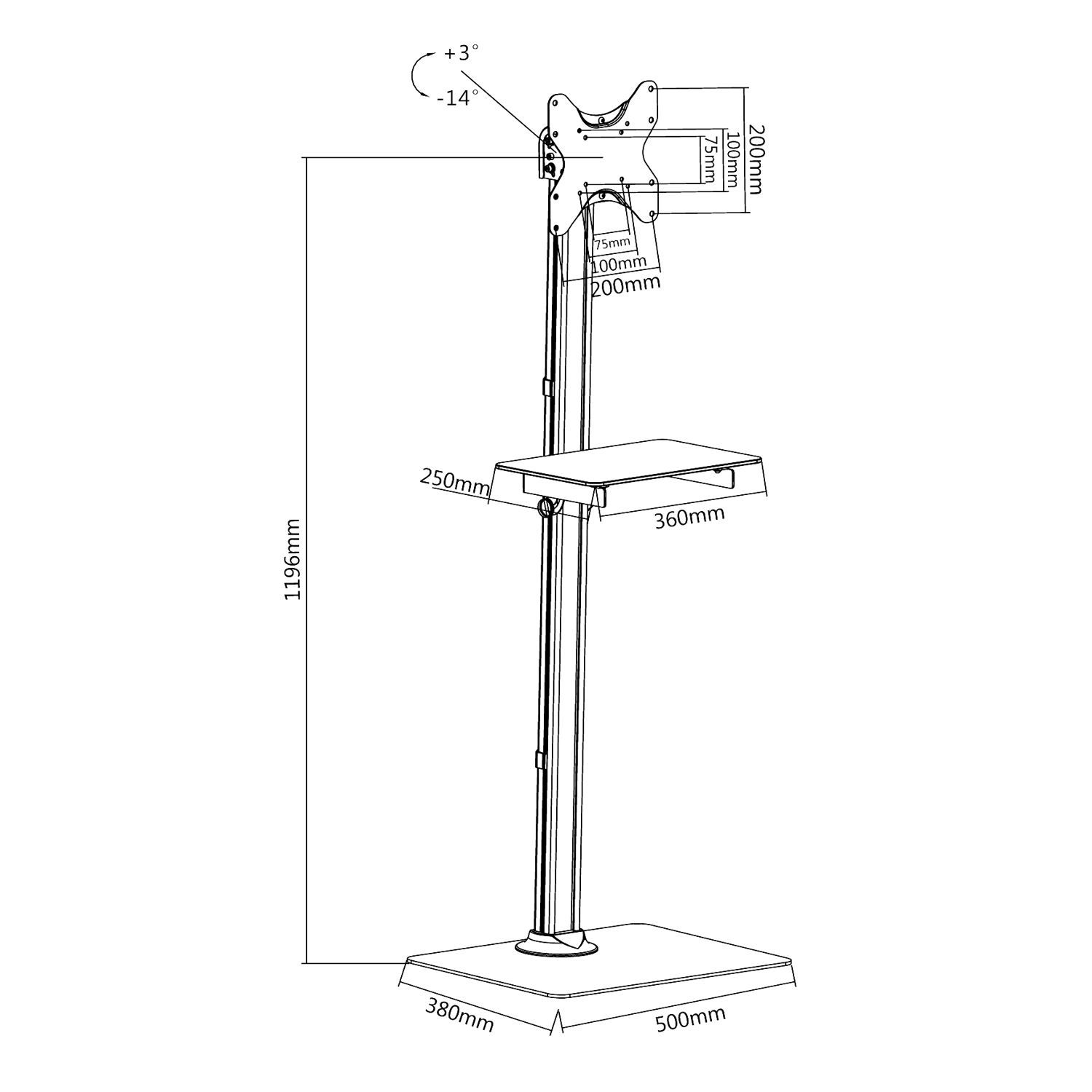 Le support se compose d'une solide base de sol, plate, d'une colonne avec étagère et surmontée d'une fixation pour installer votre écran et l'orienter selon votre besoin (inclinaison +3°/-14°, pivot +/-3°) pour le meilleur confort d'utilisation.