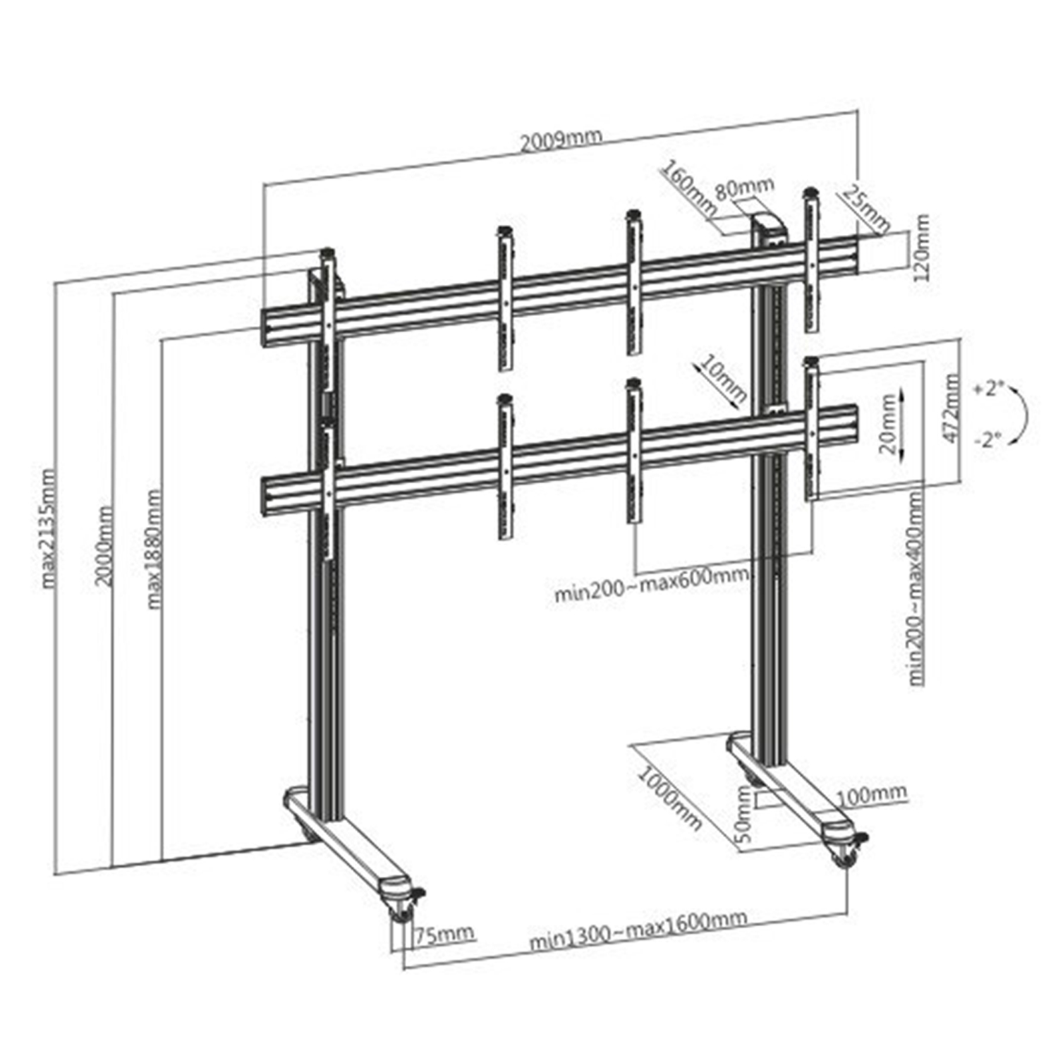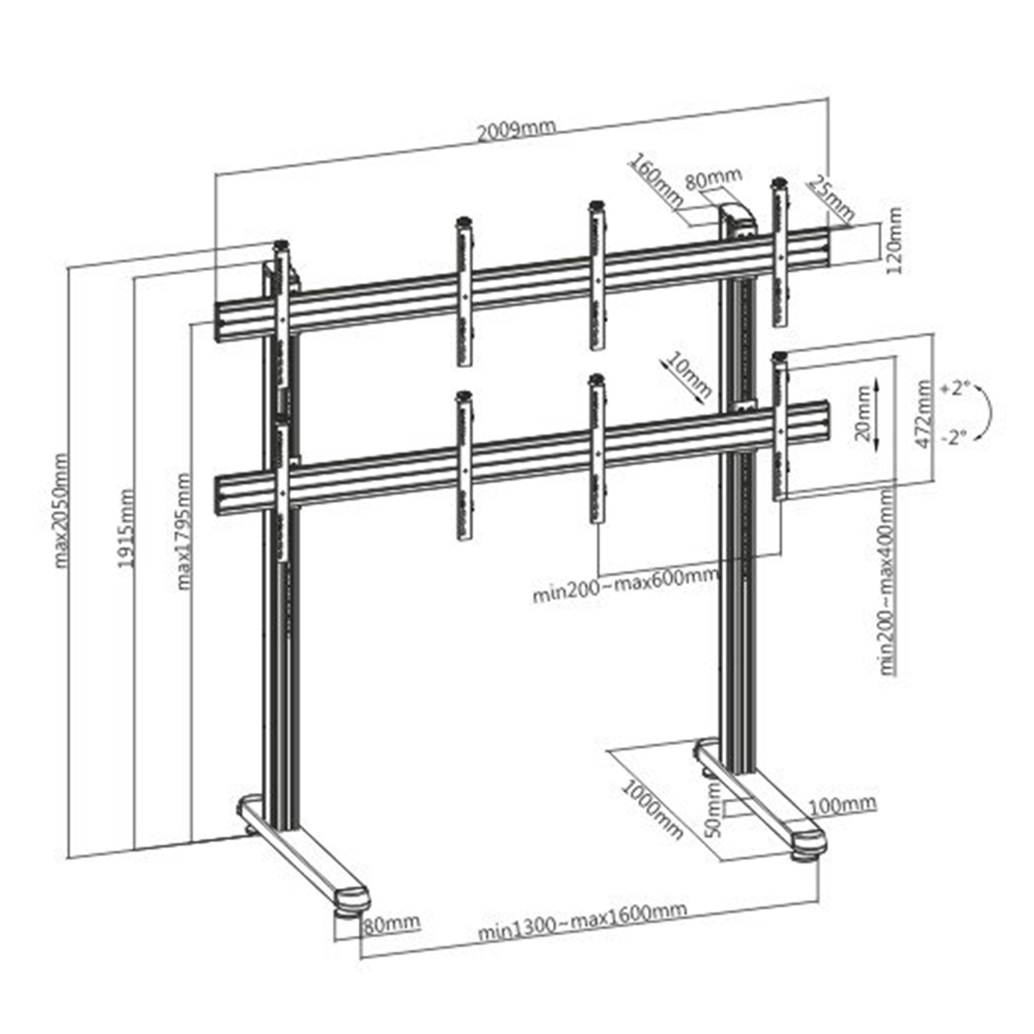 Distance entre chaque pied réglable de 130 à 160 cm qui permet de positionner les écrans en mode paysage ou en mode portrait et pour s'adapter à toutes vos configurations,