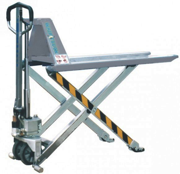 Un transpalette manuel inox haute levée d'une hauteur de levage de 800 mm et d'une capacité de 1000 kg.