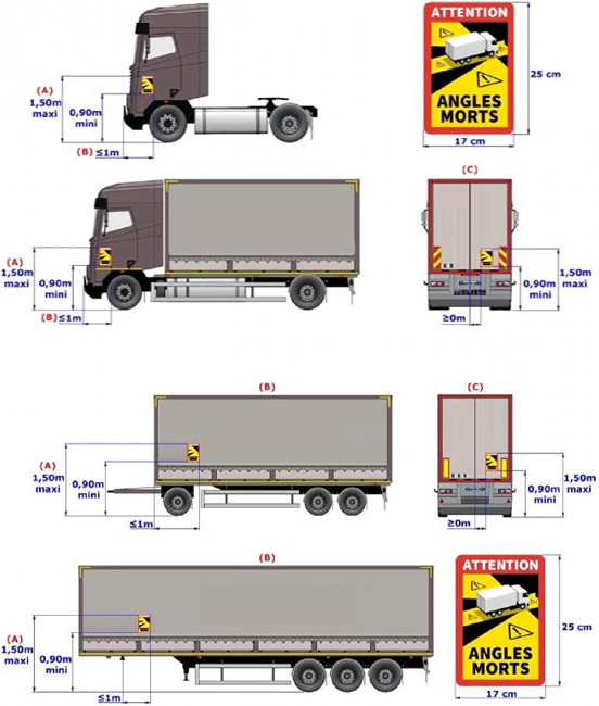 Tous les angles morts marqués sur les véhicules à moteur et les véhicules tirés doivent être soumis au code de la route, ils sont définis avec précision en fonction de la taille du véhicule et sont installés de manière à ce qu'il ne puisse pas gêner la visibilité des différents feux et équipements de signalisation et le champ de vision du conducteur.