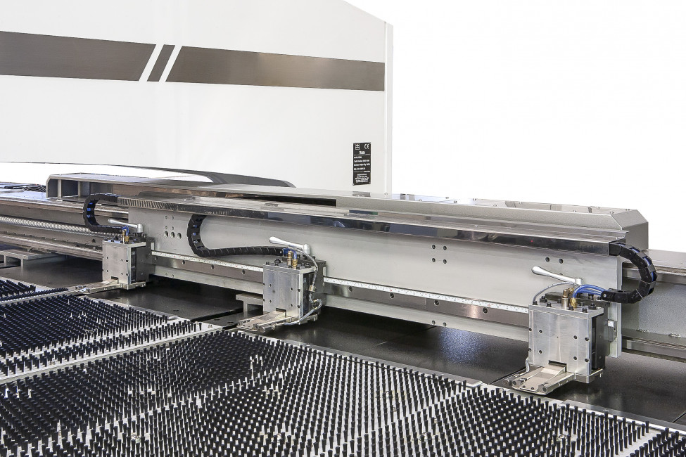Les machines sont fournies avec des pinces programmables pour le blocage des tôles, des billes mobiles pour le support de charge en tôle, des brosses sur les porte-matrices pour protéger vos pièces et des douilles interchangeables pour maintenir la précision de la tourelle.