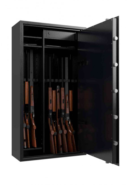 Avec ses 2 râteliers amovibles, ses 6 étagères réglables et son coffre intérieur à serrure clé A2P, vous pouvez organiser facilement vos armes longues avec ou sans optique, ainsi que vos accessoires.