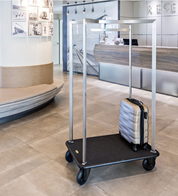 Ce chariot pour hôtel est équipé de deux roues fixes et de deux roues pivotantes, une configuration qui simplifie et sécurise la conduite.