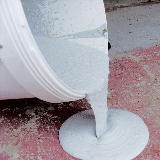 Un seau de 25 kg contient deux composants : un liquide blanc laiteux et de la poudre grise.