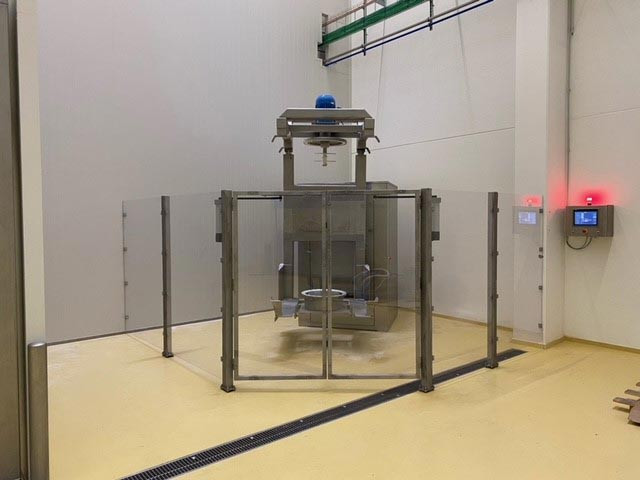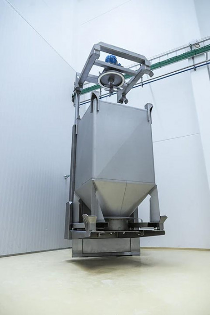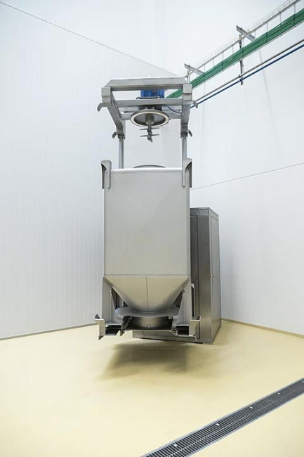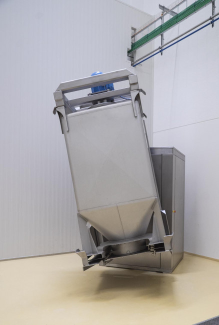 Le conteneur du mélangeur est chargé sur la plateforme du mélangeur et sécurisé en position par un système automatique.