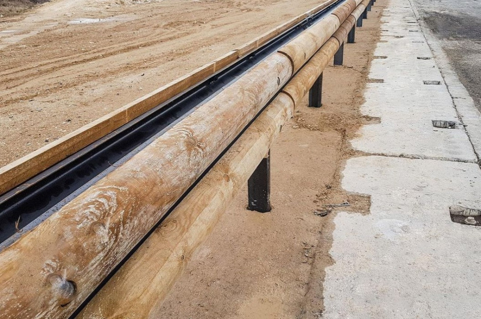 - Deux lisses métalliques double ondes recouverte d'un habillage bois de 4 demi-rondins de bois en pin autoclavé cl. 4 de section Ø160mm.