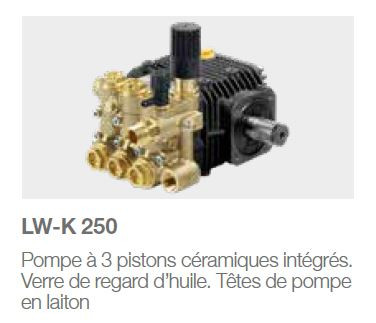 - Pompe type Comet LW-K (3 pistons céramiques intégrés et tête de pompe en laiton) avec voyant d'huile