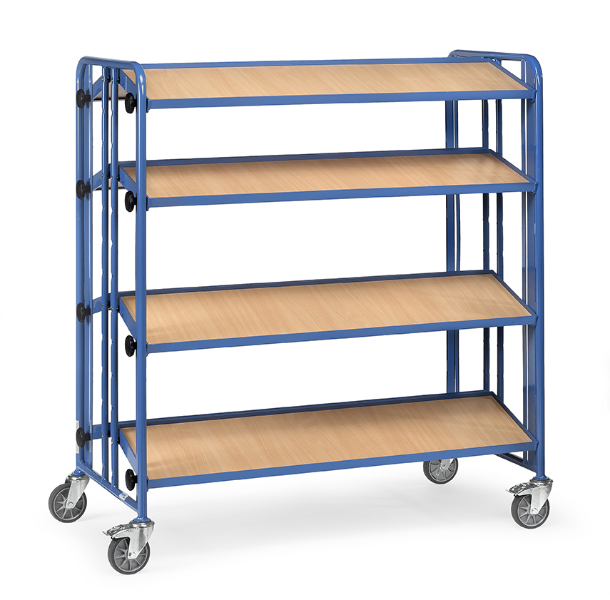 Ce chariot muni de 4 plateaux à 2 côtés en mélaminé, rebords de 12 mm de haut, principalement utilisé pour la manutention de charges diverses en magasin ateliers ou industries.