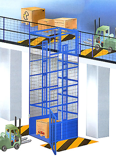 protection par jupe ou cage métallique, commande programmée, le monte charge monte, en même temps le compagnon monte par l"escalier.