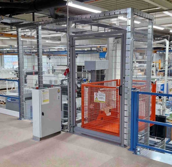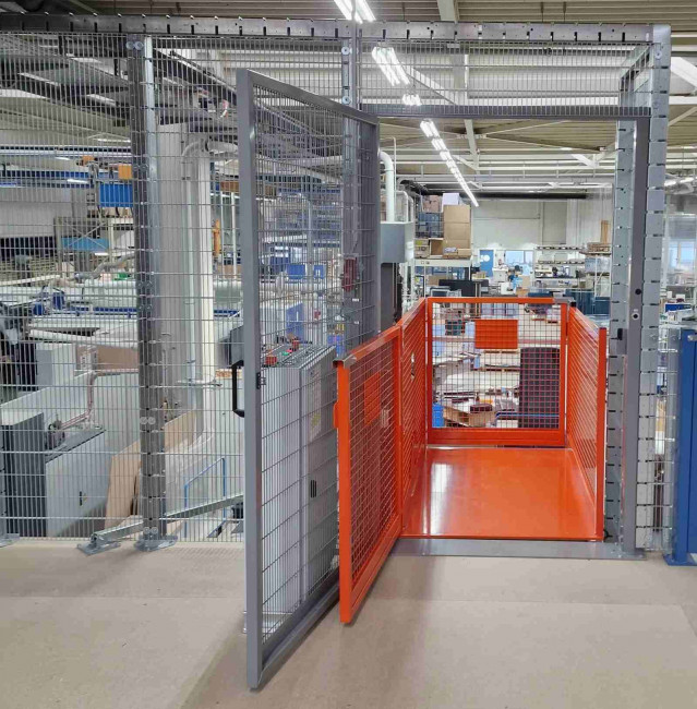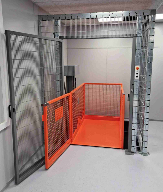 La cage de levage dispose d’un plancher plat avec rampe intégrée côté chargement, évitant toute fouille au sol et facilitant l’accès.