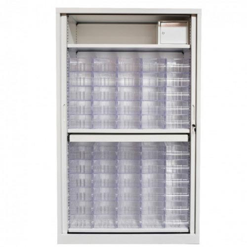Les aménagements internes modulables, l’étagère supérieure pour dossiers suspendus et le fond plat obtenable par étagère amovible facilitent la gestion quotidienne des dotations mensuelles et de la PDA (Préparation des Doses à Administrer).