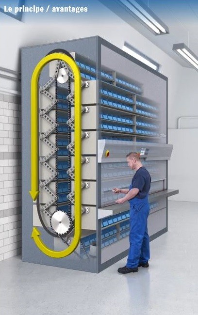 Le principe du rayonnage rotatif permet d'exploiter au maximum la hauteur sous plafond, d'obtenir un gain de place et de temps.Le stockeur peut être piloté par un terminal de commande et peut aussi être connecté à la plupart des réseaux d'entreprises ERP pour un suivi des stocks en temps réel.