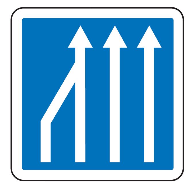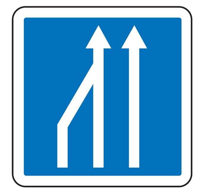 Ce panneau d'indication d'une réduction du nombre de voies de type C28 est conçu pour indiquer une réduction du nombre de voies sur routes à chaussées séparées sans accès riverain.