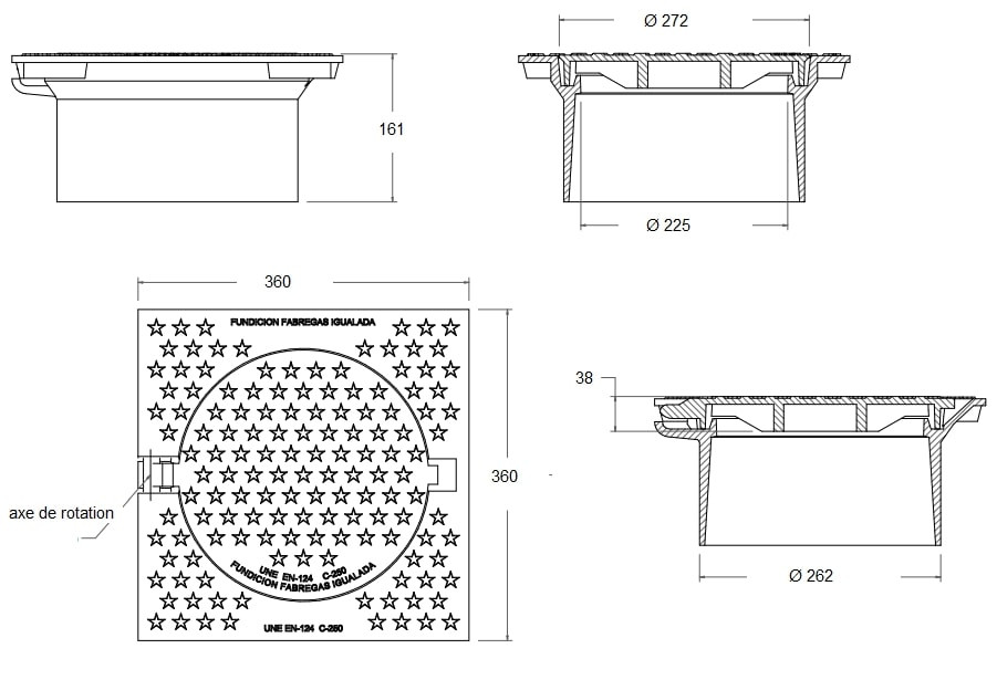 Ce modèle, avec une trappe circulaire de Ø272 mm et un cadre de 360 x 360 mm, est idéal pour une installation sur les trottoirs et dans les espaces publics.