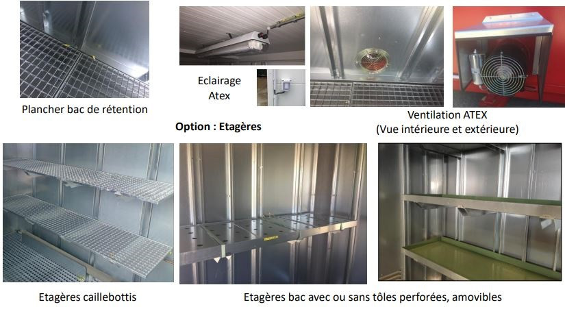 - Les produits sont stockés sur un bac de rétention recouvert de caillebotis avec une charge admissible de 1000 kg/m².