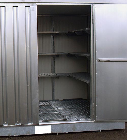 Bungalow en acier galvanisé avec rétention intégrée adapté pour le stockage des produits dangereux (DMS, produits chimiques et tous types de produits polluants).