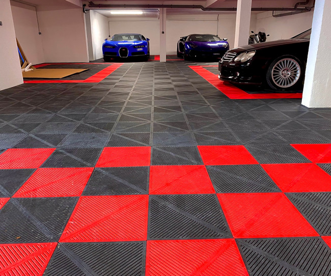 Personnalisez votre sol de garage sans outils spéciaux et sans expérience ni adhésif. Contrairement à la peinture époxy ou à la peinture de sol, aucun travail de préparation n’est nécessaire et surtout : pas d’arrêt de votre activité = pas de perte de chiffre d’affaire.