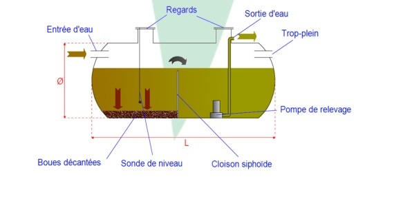 Il fait transiter les eaux dans une cuve horizontale grâce à leur volume et une cloison siphoïde scindant la cuve en 2 parties à savoir :