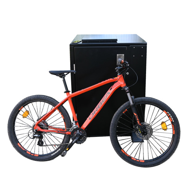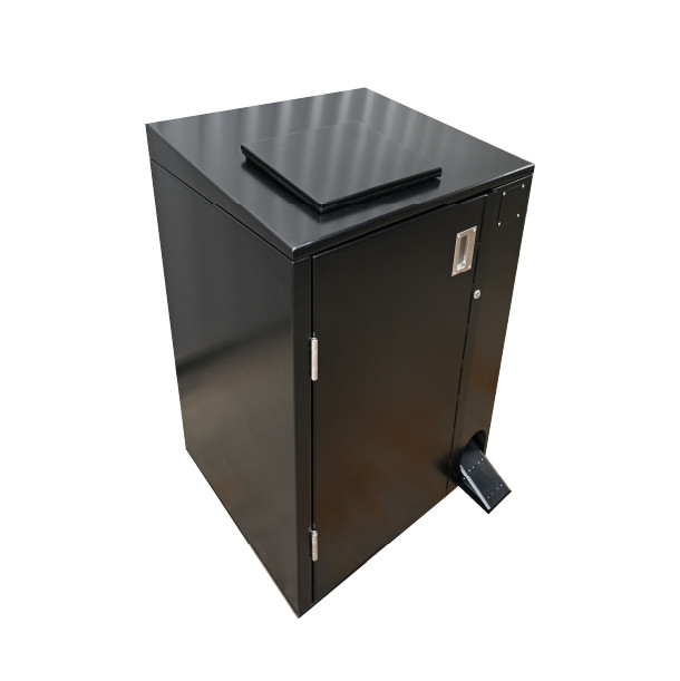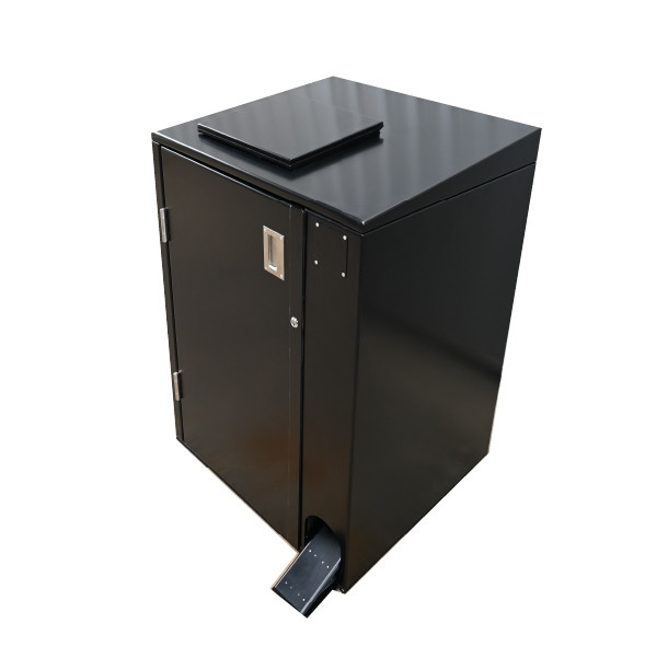 Notre abri-bac est équipé d'une pédale astucieusement positionnée au sol, permettant aux cyclistes d'ouvrir le conteneur en toute simplicité. Il leur suffit de rouler sur la pédale pour déclencher l'ouverture de l'abri-bac biodéchets.