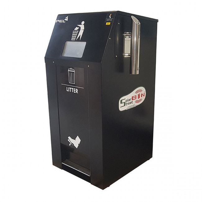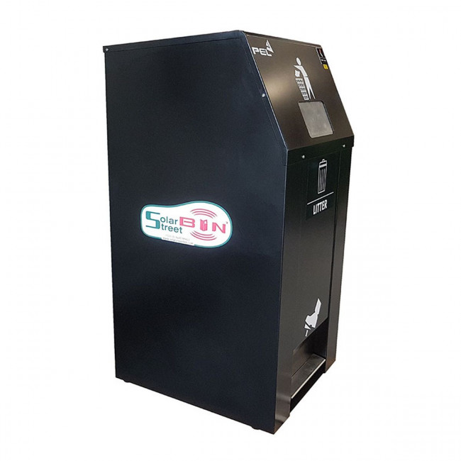 La poubelle est dotée d'un mécanisme de compactage interne alimenté à l'énergie solaire.