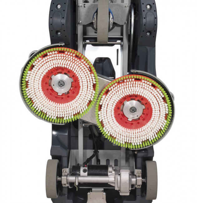 Cette configuration à double brosse offre un équilibre optimal entre pression au sol, enlevage de saletés et maniabilité sur zones encombrées, avec marche avant/arrière pour des reprises de bandes efficaces.