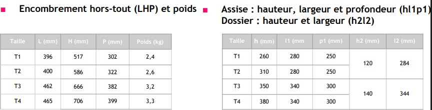 Disponible en 4 tailles évolutives (260 à 380 mm de hauteur d'assise)