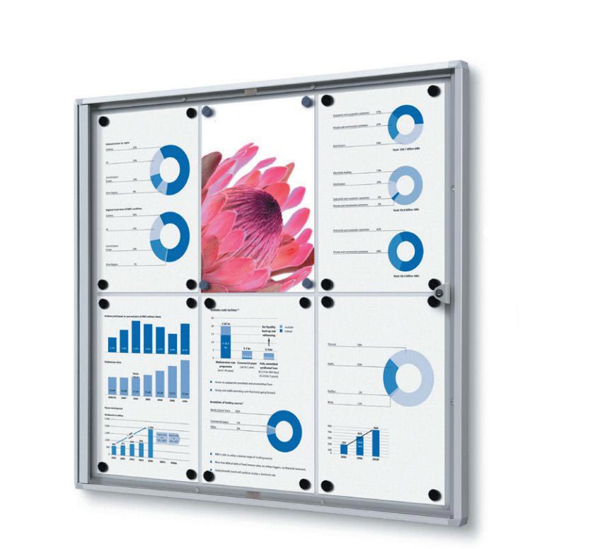 Formats : de 1 x A4 à 12 × A4 Fond magnétique Cadre aluminium anodisé Porte battante acrylique Serrure et 2 clés