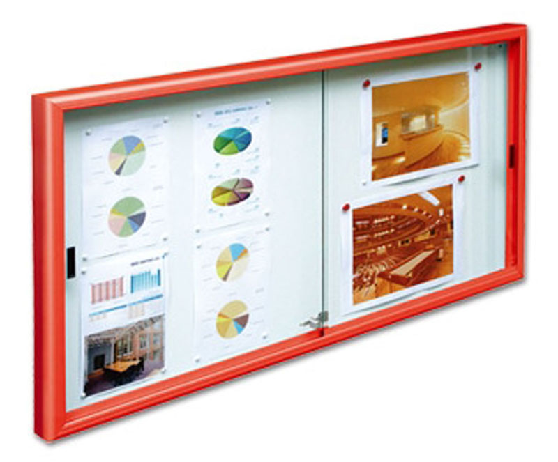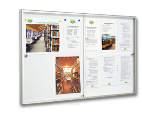 Format : 8 ou 12 A4 2 portes coulissantes, 1 serrure 2 clés Cadre : aluminium anodisé argent Fixation : Murale
