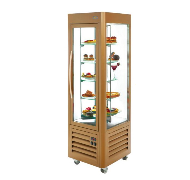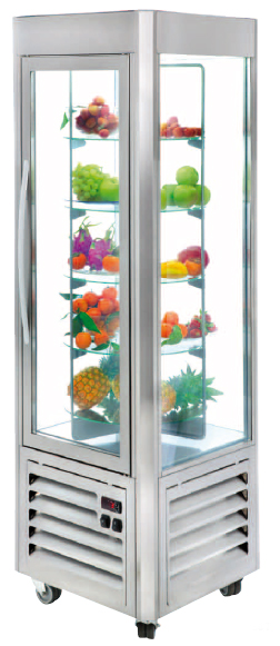 La vitrine verticale ventilée entièrement panoramique est conçue pour mettre en valeur certains aliments.