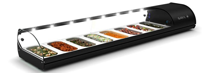 La vitrine réfrigérée, de dimensions 1438 x 395 x 245 mm, vous permettra d'exposer idéalement vos tapas, salades ou fruits.