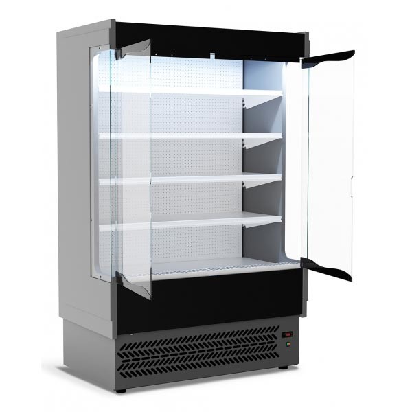 Grâce à ses portes pivotantes, cette vitrine est idéale pour le libre service dans les supermarchés et les espaces d’expositions de produits frais.