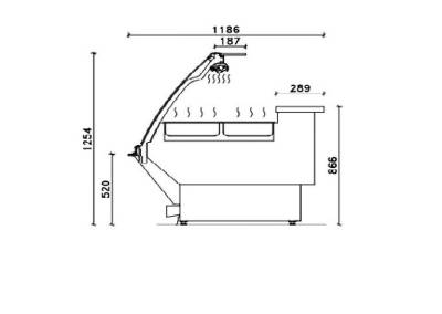 Dimensions (l x h x p) mm : 1186 x 1254 x 910 mm Hauteur du plan d'exposition : 520 mm Profondeur de la tablette de travail : 289 mm Hauteur du meuble réfrigéré : 998 mm Distance entre la lampe chauffante et la cuve : 187 m