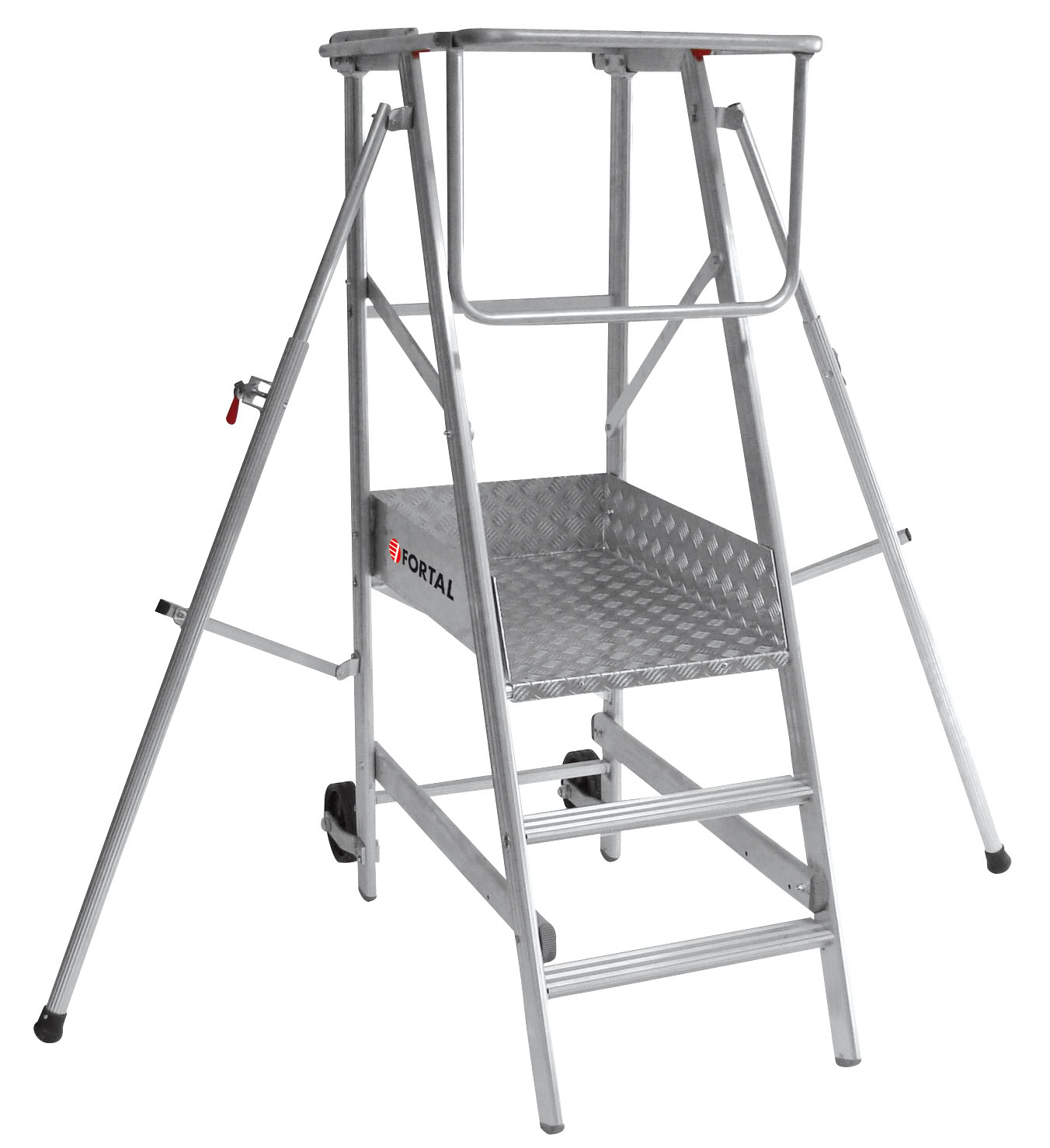 Les stabilisateurs télescopiques en aluminium, qui se rabattent facilement, garantissent une stabilité optimale pendant l'utilisation, tandis que le plancher largement dimensionné assure une prise en charge confortable et sûre pour l'opérateur.