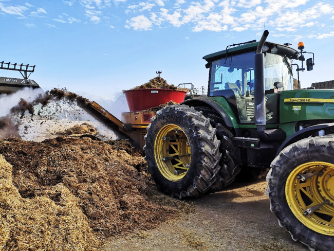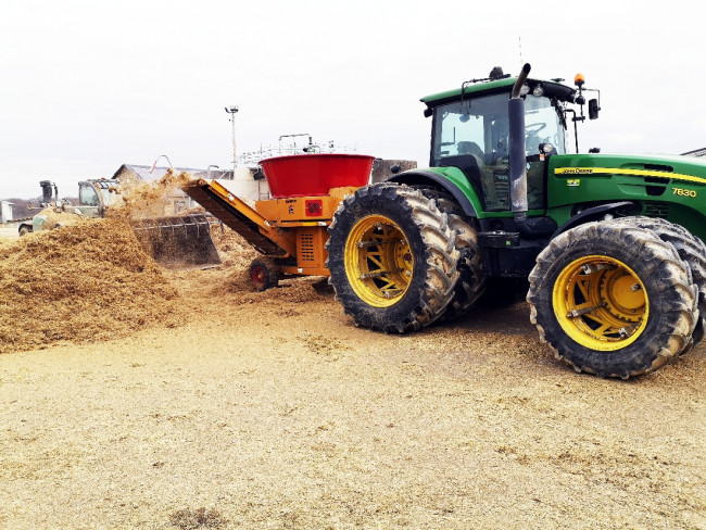 Hauteur de sortie maximum à hauteur de 2200 mm – En avançant avec le tracteur on évite la reprise permanente des broyats à la chargeuse