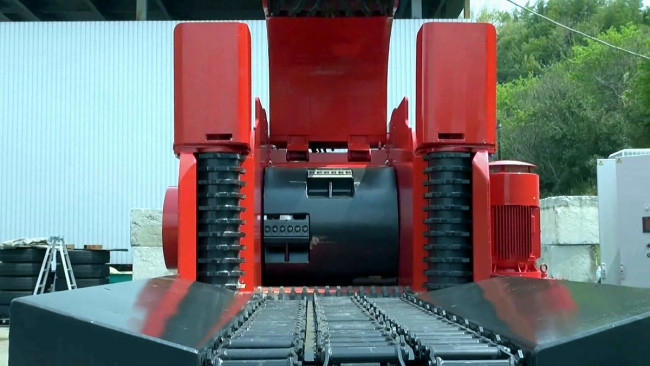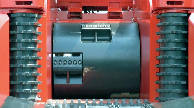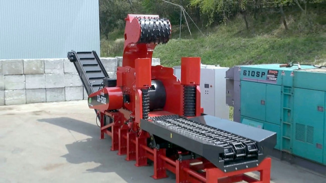 Le rouleau d’alimentation inférieur fait 335 mm de diamètre et 940 mm de large, le rouleau supérieur fait 756 mm et 868 mm de large, les deux rouleaux verticaux font 335 mm de diamètre et 810 mm de hauteur, ils sont tous munis de crocs très agressifs.