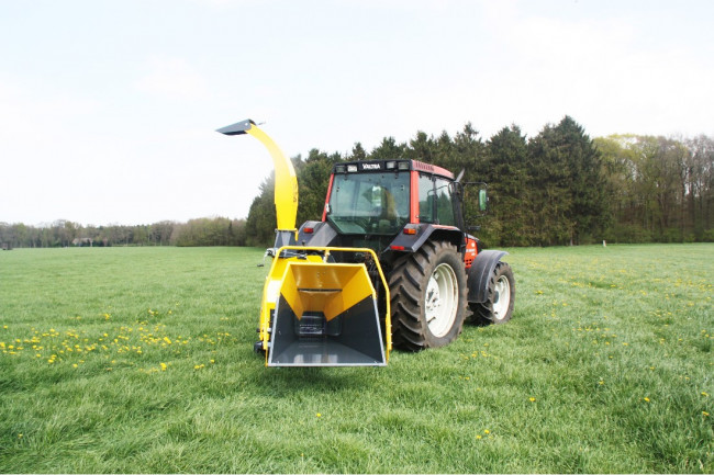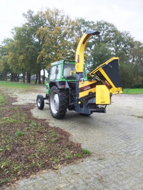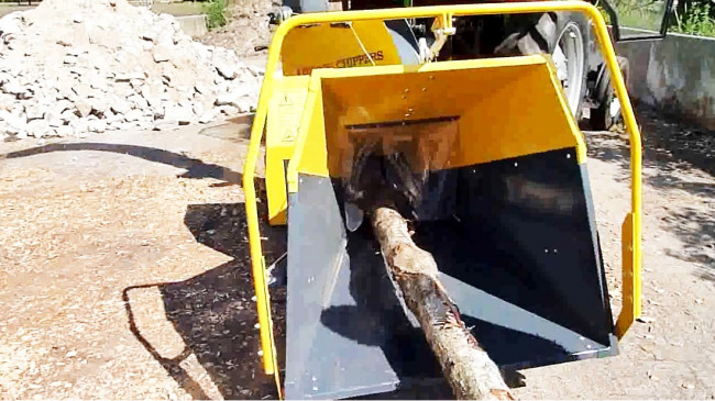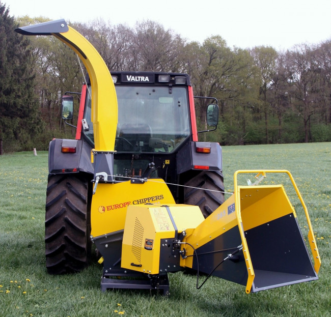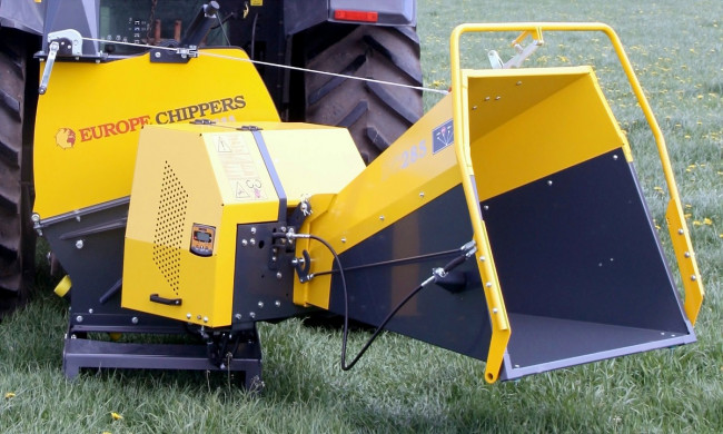 Ce broyeur a plaquette EUROPE CHIPPERS DC285 est entraîné par la prise de force d’un tracteur jusqu’à 125 CV.
