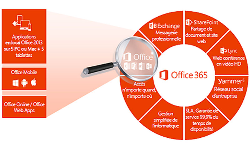 Vous aurez l’accessibilité en ligne à la bureautique, exchange online professionnel, web conférence, partage collaboratif share point, réseau social d’entreprise yammer et stockage d’information one drive.