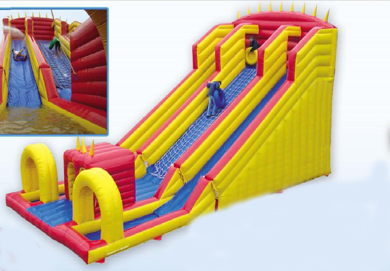 Dimensions: Longueur 14,Om x largeur 7,Om x hauteur totale 7,5m - hauteur toboggans S,S m - pente 35°