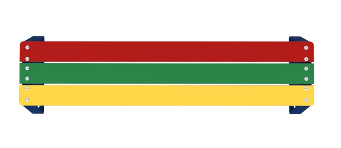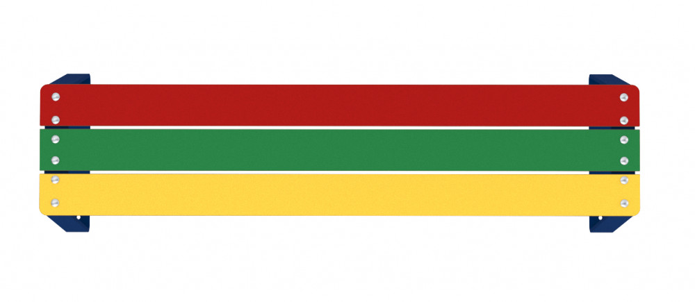 La banquette extérieure pour enfants est proposée en version multicolore : lames ROUGE, VERT, JAUNE, associées à des pieds métal BLEU RAL 5017.