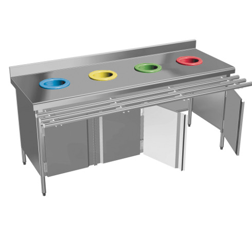 meuble de débarrassage avec portes battantes doublées pour permettre le passage des poubelles ainsi qu’éviter la propagation des odeurs.
