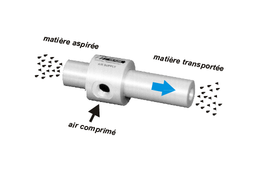 - L’air comprimé est envoyé dans la bague extérieure regroupant 3 ou 6 conduits dirigés en oblique vers le tube principal.