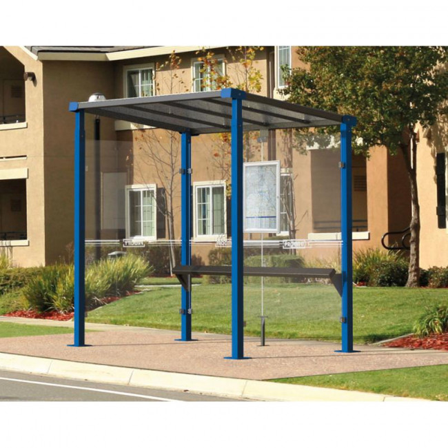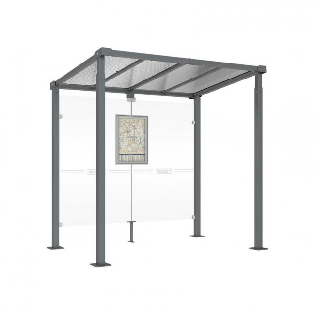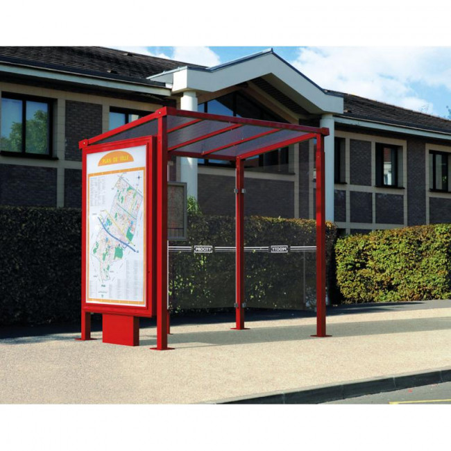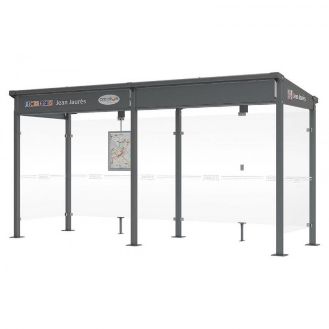 La station bus Milan dispose de 4 à 6 poteaux de section 80 x 80 mm pour un abri le plus solide possible. La toiture se compose de polycarbonate alvéolaire anti UV d’une épaisseur de 10 mm. Les bardages de fond sont en verre sécurisé d’épaisseur 8 mm. Cet abri bus est équipé d’une vitrine horaire de 750 x 550 mm d’épaisseur 30 mm en aluminium anodisé (fermeture par clef).