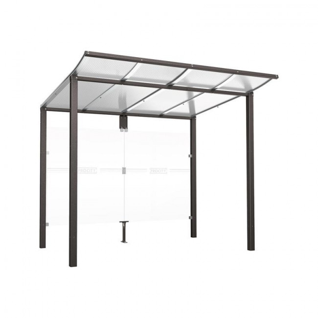 La toiture est composée de profilés aluminium anodisé, renforcée par des traverses acier et protégée par des panneaux en polycarbonate alvéolaire de 10mm, traités anti-UV.
