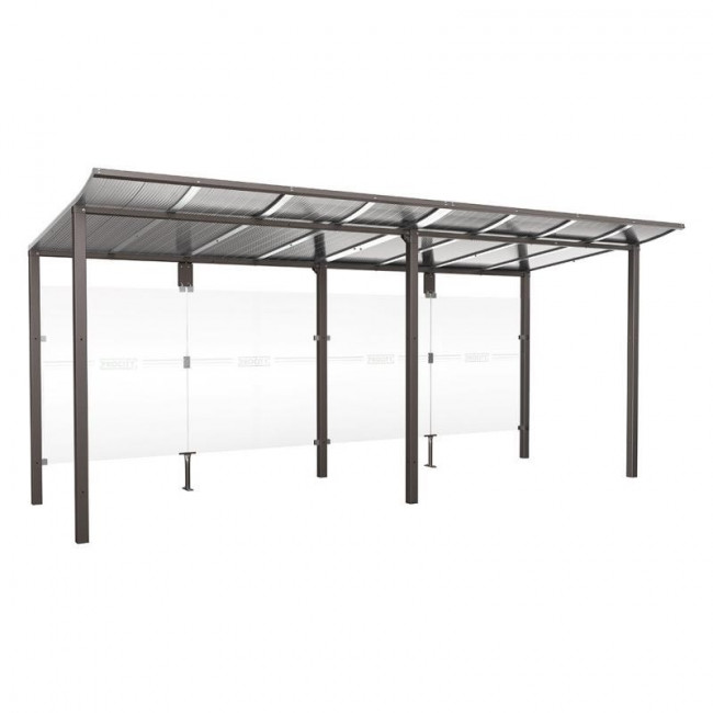 Les bardages latéraux et de fond sont réalisés en verre sécurisé de 5mm, fixés via un système de pincement en Zamak brossé pour une résistance accrue au vandalisme.
