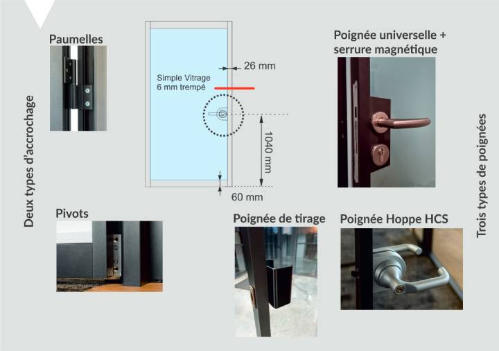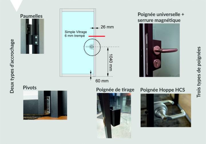 Selon votre configuration, la porte pour cloison vitrée bureau peut être montée sur paumelles standards ou sur pivots. Vous avez le choix entre plusieurs poignées : poignée de tirage intégrée ou magnétique, poignée HCS HOPPE, système de flasques universelles pour canon standard. Ces options permettent de créer une cloison vitrée bureau porte battante ou coulissante parfaitement adaptée à vos besoins.