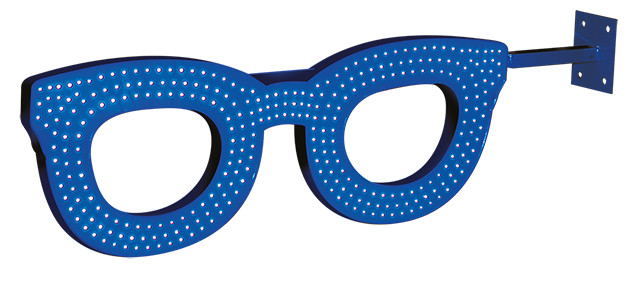 l'enseigne en forme de lunettes prête à installer au mur avec sa fixation.