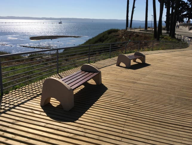 Banquette publique en béton avec assise en bois