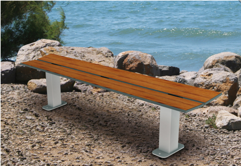 Banquette d'extérieure en acier associe l'écologie à l'excellence qualitative des ses matériaux,dont le « compact » en cinq aspects bois.