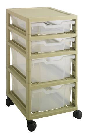 La structure en polypropylène beige montée sur quatre roulettes pivotantes Ø 50 mm assure la mobilité et la stabilité du chariot, tandis que les bacs amovibles permettent une prise en main rapide et un nettoyage simplifié.