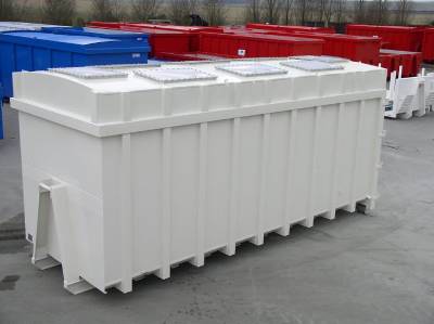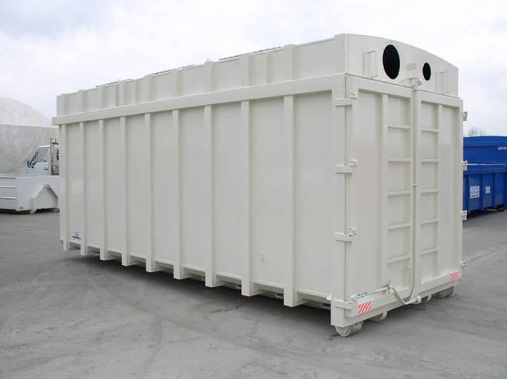 Structure en acier S235, fond et côtés épaisseur 4 mm 8 évents ATEX intégrés sur la toiture Rouleaux arrière Ø200 mm avec bagues auto-lubrifiantes Hauteur d’accrochage : 1425 mm Anneau de préhension Ø50 mm Échelles avant et arrière